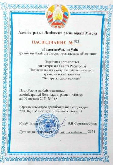 31 декабря 2020 г. прошло собрание женского актива Совета Республики и его Секретариата, на котором принято решение о создании первичной организации общественного объединения «Белорусский союз женщин».
