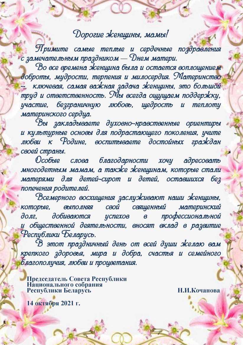 Поздравление Председателя Совета Республики Н.Кочановой с Днем матери