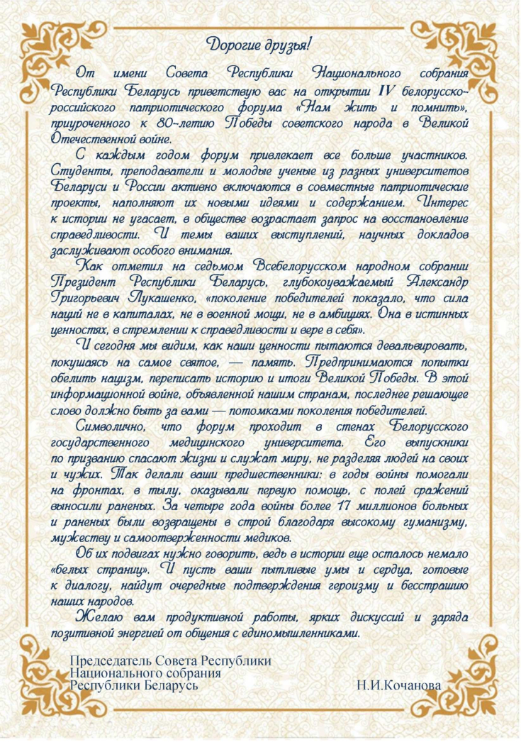 Участникам IV белорусско-российского патриотического форума «Нам жить и помнить», приуроченного к 80-летию Победы советского народа в Великой Отечественной войне