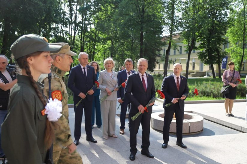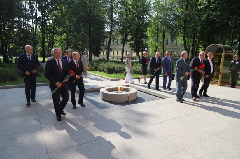 Парламентарии Беларуси и России также приняли участие в церемонии возложения цветов к мемориалу «Вечный огонь славы», провели встречу с руководством Новгородской области, посетили ряд промышленных предприятий в Великом Новгороде.