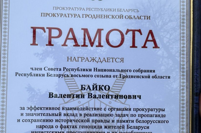 Прокуратурой Гродненской области Валентин Байко награжден грамотой за эффективное взаимодействие с органами прокуратуры и значительный вклад в реализацию задач по пропаганде и сохранению исторической правды и памяти белорусского народа о фактах геноцида жителей Беларуси нацистскими преступниками и их пособниками в годы Великой Отечественной войны и в послевоенный период.