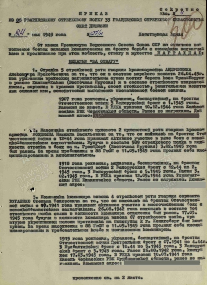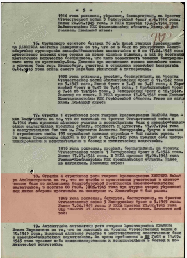 Олег Валентинович рассказал и про своего деда — Жингеля Макара Александровича, 1909 года рождения. Место рождения: Белорусская ССР, Витебская обл., Глубокский р-н, дер. Гавриленки. Макар Александрович не любил вспоминать о войне. Он воевал в 88-м гвардейском стрелковом полку 33-й гвардейской стрелковой дивизии. Был пулеметчиком, имел два ранения и контузию. Был награжден медалью «За отвагу», орденом Отечественной войны II степени и другими многочисленными наградами. Но самой дорогой он считал медаль «За взятие Кёнигсберга».