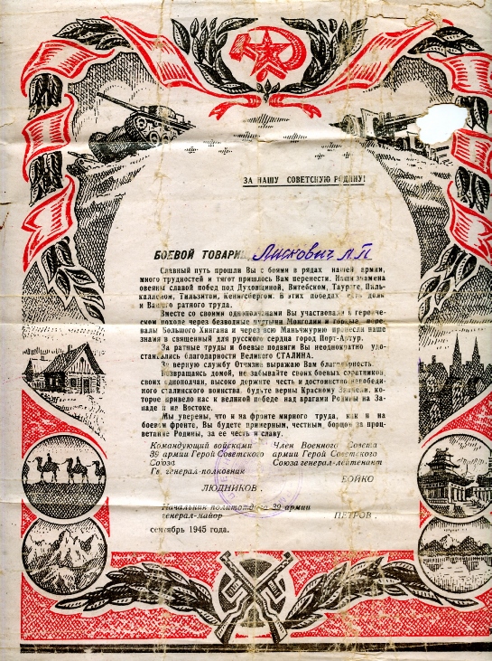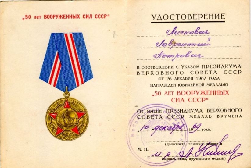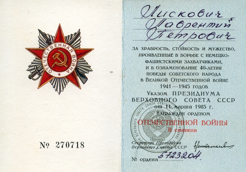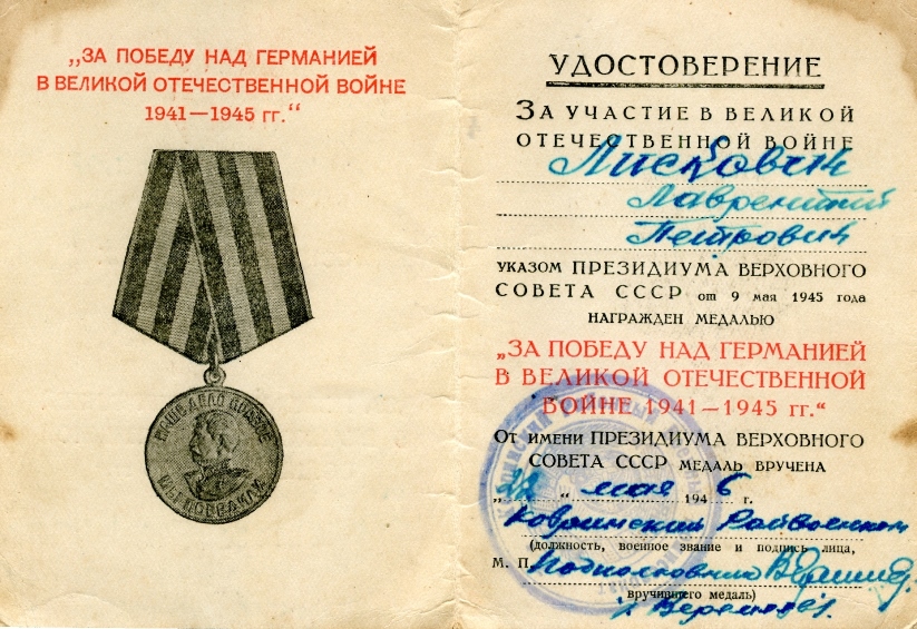 Дед по линии отца — Лаврентий Петрович — с первых дней вторжения врага на территорию нашей страны оказывал партизанам всяческую помощь и поддержку, шил для них кожухи. В 1944 году, когда Беларусь освободили, его забрали в действующую армию. Он дошел до Будапешта, где был ранен. Затем дедушка служил в саперном полку, был передислоцирован в воинскую часть в район Японского фронта, где закончил войну в январе 1946 г.