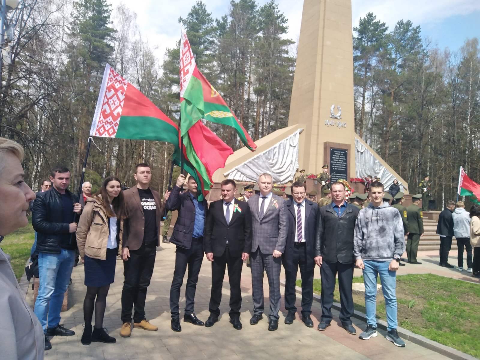 На фото: Константин Дроздовский, глава администрации Первомайского района г. Минска Дмитрий Шашок, депутаты Минского городского Совета депутатов Эдуард Кузнецов, Вячеслав Кузнецов, Сергей Мазовка, идеологический актив администрации Первомайского района г. Минска, представители Первомайского районного объединения организаций профсоюзов, курсанты и офицеры Военной академии Республики Беларусь и др.