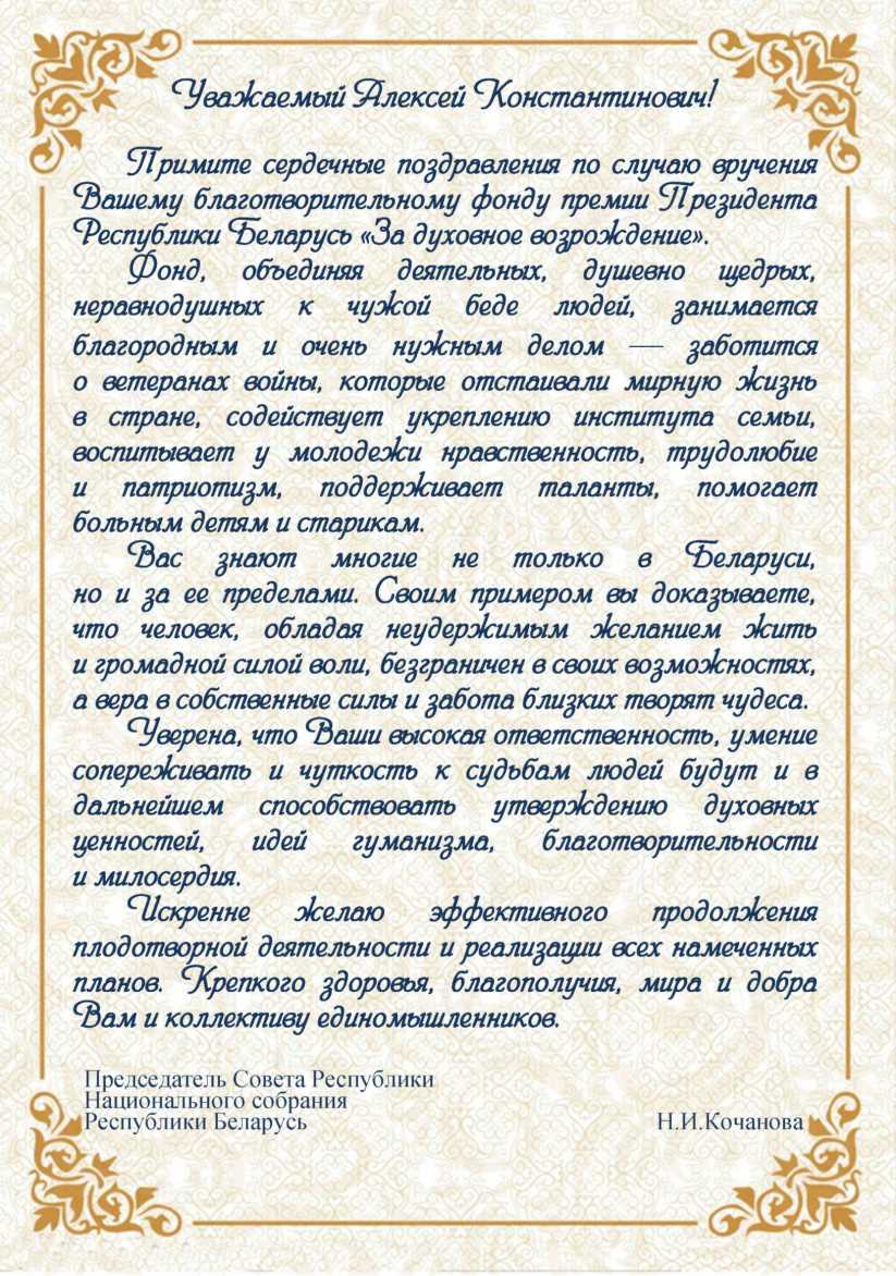 Председатель Совета Республики Н.Кочанова направила поздравление А.Талаю в связи с вручением благотворительному фонду премии Президента Республики Беларусь «За духовное возрождение»