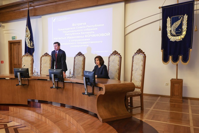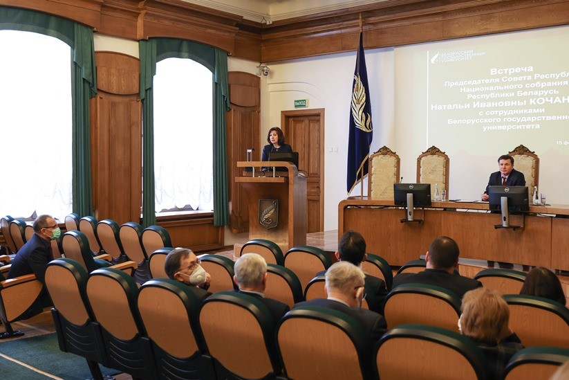 Председатель Совета Республики Национального собрания Наталья Кочанова 15 февраля 2021 г. провела встречу с руководством Белорусского государственного университета. Такие встречи — это возможность детально обсудить насущные вопросы на высоком уровне, что особенно актуально для ведущего вуза страны в юбилейный год. В 2021-ом БГУ исполнится 100 лет.