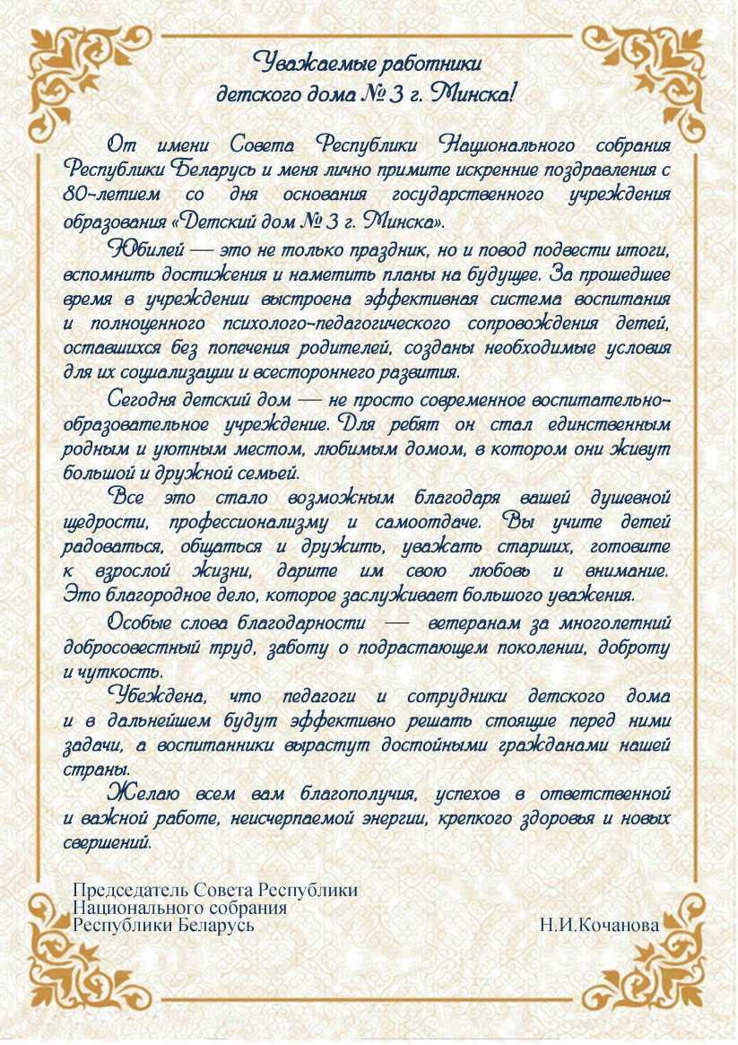 С 80-летием! Коллективу государственного учреждения образования «Детский дом № 3 г. Минска»