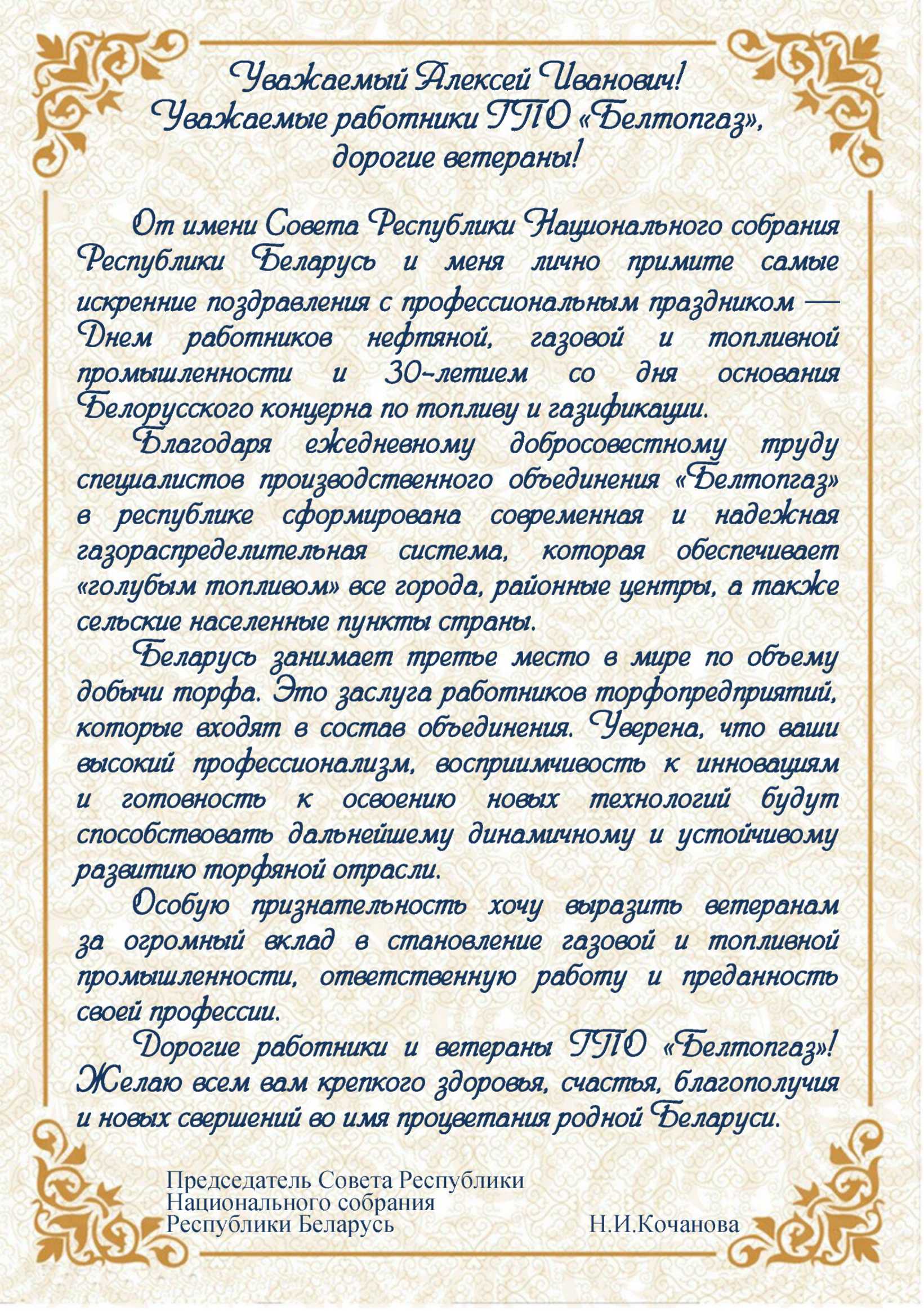 Поздравительный адрес трудовому коллективу ГПО «Белтопгаз»