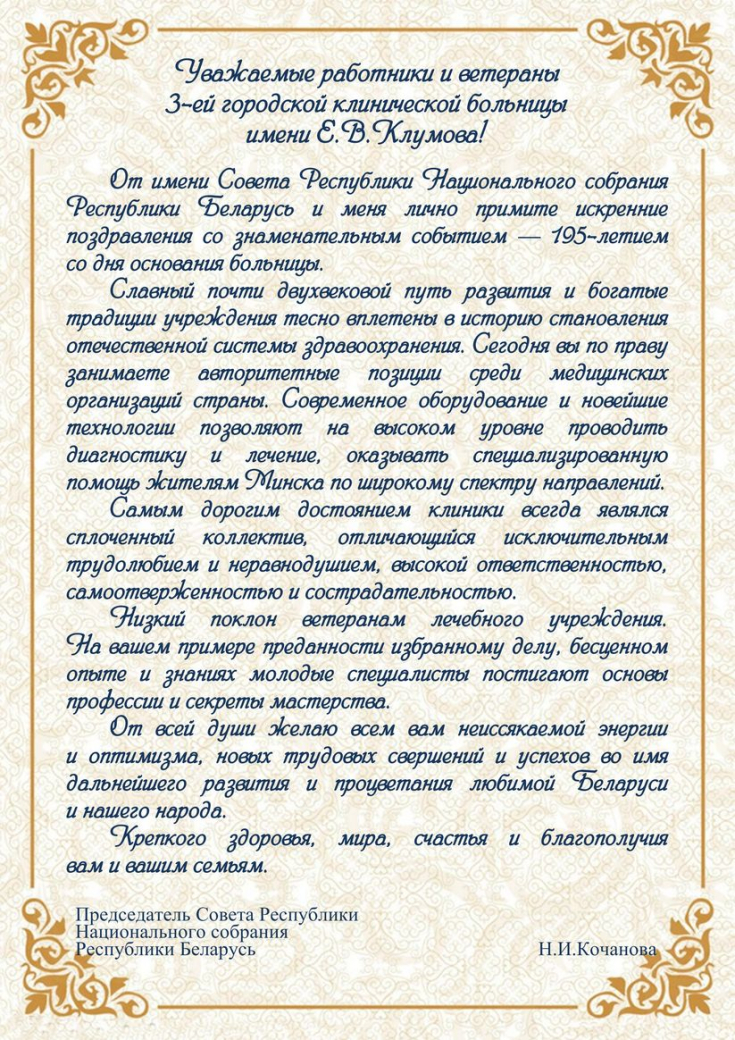 С юбилеем! Коллективу учреждения здравоохранения «3-я городская клиническая больница имени Е.В.Клумова»