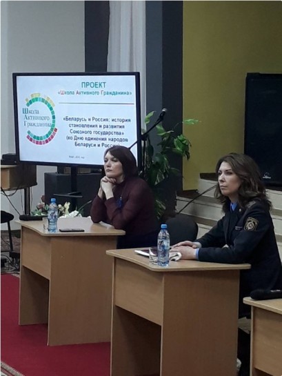 25 марта 2021 г. председатель первичной организации ОО «Белорусский союз женщин» Секретариата Совета Республики Тамара Леончик и председатель объединенной организации ОО «БСЖ» Министерства внутренних дел Ольга Чемоданова приняли участие в занятии для учащихся 9 — 11 классов по теме «Беларусь и Россия: история становления и развития Союзного государства» (ко Дню единения народов Беларуси и России).